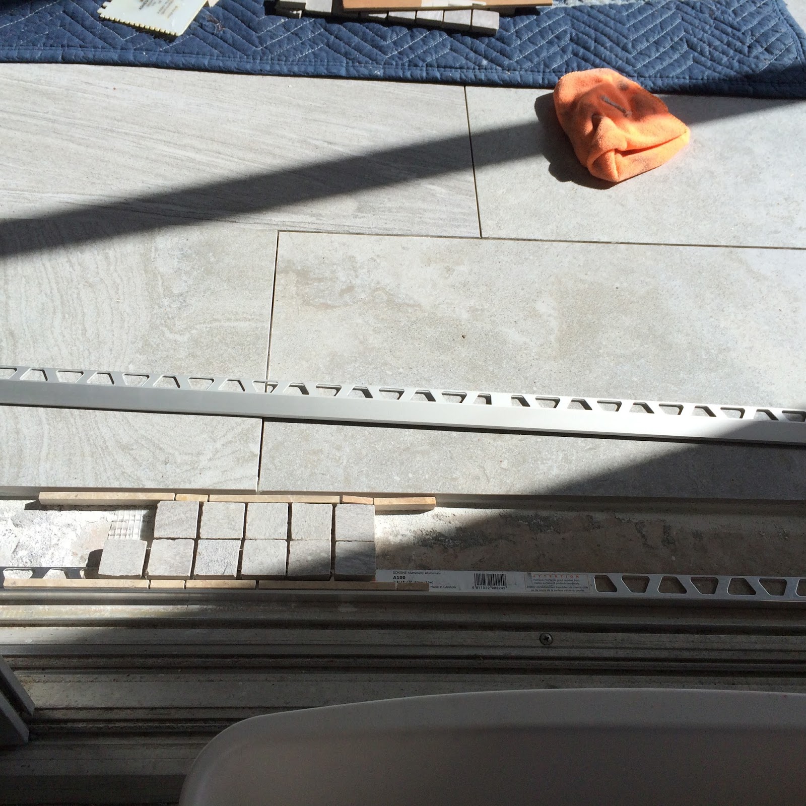 Here we used the Schluter trim again, being careful not to cover the existing track in case that ever has to be replaced. I was undecided between using one or two lines of the bamboo pencil thin tiles.